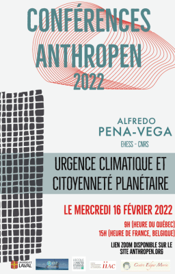L’équipe d’Anthropen, dirigée par Francine Saillant (CELAT) et Mondher Kilani, vous convie, le mercredi 16 février à 9 h, à la conférence « Urgence climatique et citoyenneté planétaire », présentée par Alfredo Pena-Vega, enseignant-chercheur en socio-écologie à l’EHESS et au centre […]