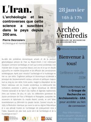 En 2022, la programmation des Archéo-vendredis débute en force par une présentation de Pierre Desrosiers, archéologue et membre associé de CELAT. Prévue le vendredi 28 janvier, de 16 h à 17 h, la conférence, intitulée « L’Iran. L’archéologie et les controverses que […]