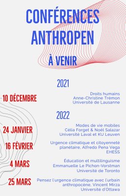L’équipe d’Anthropen, dont fait partie notre membre émérite Francine Saillant, dévoilait en novembre son programme de conférences publiques pour 2021-2022. Programmation 10 DÉCEMBRE 2021, 9 h (heure du Québec) « Droits humains » Anne-Christine Trémon (Université de Lausanne) 24 JANVIER 2022, 9 h (heure […]