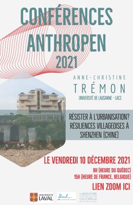 Ce vendredi 10 décembre à 9 h, l’équipe d’Anthropen (dont fait partie notre membre émérite Francine Saillant) vous invite à assister à la conférence « Résister à l’urbanisation? Résiliences villageoises à Shenzhen (Chine) », présentée sur Zoom par Anne-Christine Trémon (Université de […]