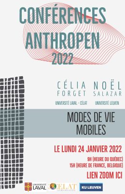 Dans le cadre des conférences Anthropen 2021-2022, Célia Forget (CELAT à l’Université Laval) et Noël B. Salazar(Université Leuven) présenteront, le lundi 24 janvier à 9 h (heure du Québec), la conférence virtuelle « Modes de vie mobiles ». Nouveau lien de […]