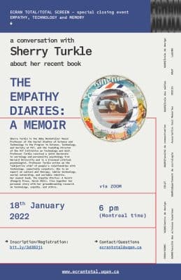 Interprétation simultanée en American Sign Language (ASL) et en langue des signes québécoise (LSQ). En clôture des activités d’ÉCRAN TOTAL, vous êtes invité.e.s à une discussion virtuelle avec Sherry Turkle (MIT) autour de son récent ouvrage The Empathy Diaries: A […]