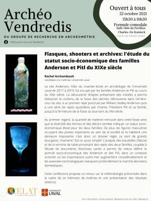 Le vendredi 22 octobre à 15 h 30, Rachel Archambault, membre étudiante du CELAT dirigée par Allison Bain, présentera la conférence « Flasques, shooters et archives : l’étude du statut socio-économique des familles Anderson et Pilt du XIXe siècle ». […]
