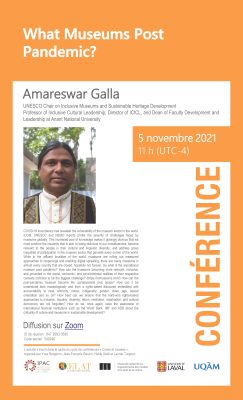 Amareswar Galla (Anant National University) présentera la conférence virtuelle « What Museums Post Pandemic? » le vendredi 5 novembre à 11 h. Cette présentation (en anglais) conclut le cycle de conférences « Crises et musées », organisé par nos membres Yves Bergeron, Jean-François Gauvin, Habib […]