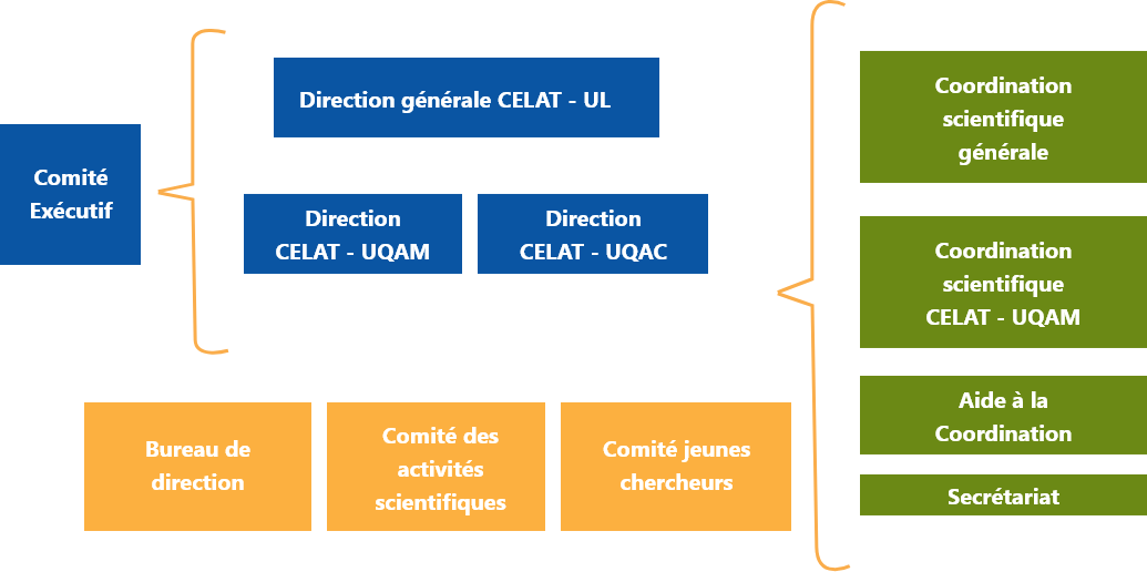 - La direction générale du Centre est assurée par un ou une membre provenant de l’Université Laval. Il ou elle travaille en collaboration avec deux autres directions, une pour chacun des autres sites, autrement désignés comme direction du CELAT à l’UQAM et direction du CELAT à l’UQAC. Leur mandat est de trois ans, renouvelable une fois.