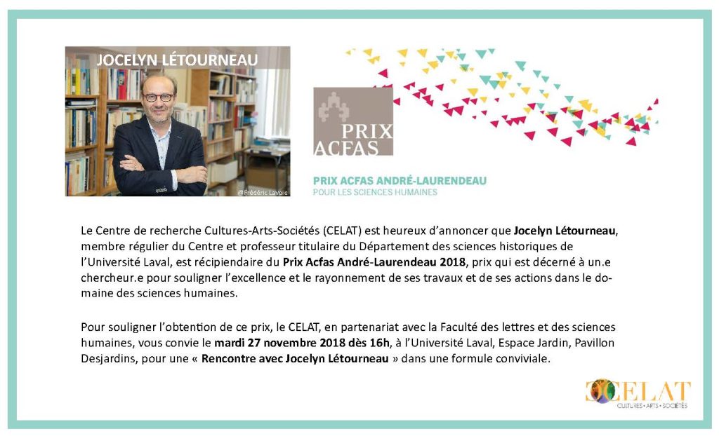 Pour souligner l’obtention de ce prix, le CELAT, en partenariat avec la Faculté des lettres et des sciences humaines, vous convie le mardi 27 novembre 2018 dès 16h, à l’Université Laval, Espace Jardin, Pavillon Desjardins, pour une « Rencontre avec Jocelyn Létourneau » dans une formule conviviale, qui mêle, pour reprendre son flambeau, l’univers scientifique et l’espace civique.