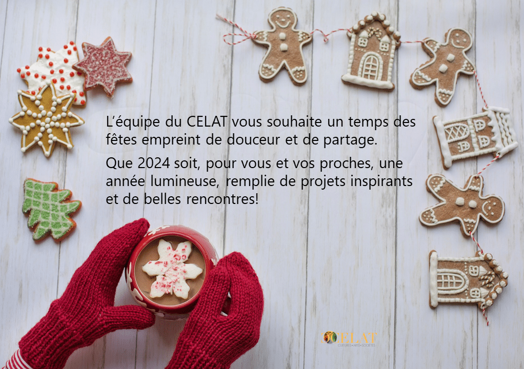 Nous vous souhaitons un temps des fêtes empreint de douceur et de solidarité et une année 2024 lumineuse! L’équipe sera en congé du 22 décembre 2023 au 8 janvier 2024, mais les locaux du CELAT-UQAM et du CELAT-UL demeureront accessibles durant les vacances des fêtes. À noter : le CELAT-UL prépare son déménagement et occupera en janvier de nouveaux espaces au 5e étage du pavillon Charles-De Koninck. La nouvelle salle des étudiant-es (DKN-5193) sera accessible dès le 11 janvier. Au plaisir de vous retrouver l’an prochain!