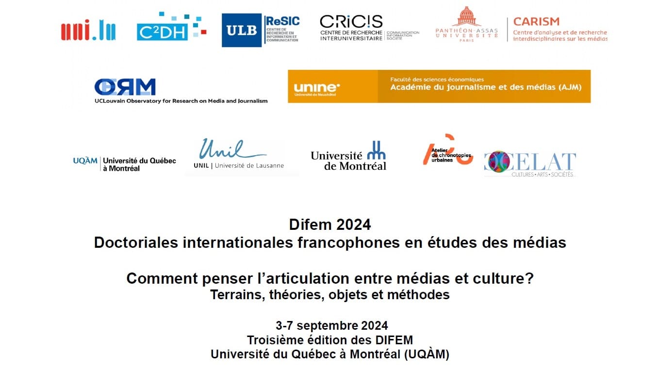 La 3e édition des Doctoriales internationales francophones en études des médias, intitulée Comment penser l’articulation entre médias et culture? Terrains, théories, objets et méthodes, se tiendra à l’UQAM du 3 au 7 septembre 2024. « Approches, contenus, pratiques, objets et méthodes seront au coeur de cette réflexion portant sur les manières de se saisir des articulations entre médias et culture en études des médias ». Notre membre Katharina Niemeyer fait partie du comité organisateur local. Nouvelle date limite pour soumettre une proposition : 11 mars 2024 4 mars 2024.