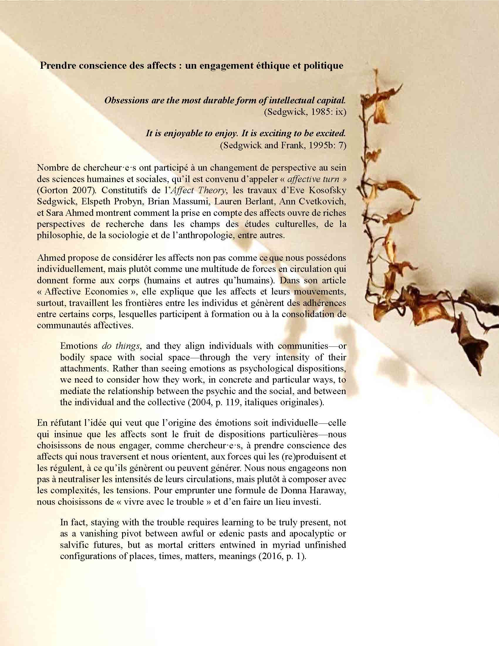 Coorganisé par notre membre postdoctorante Karine Bellerive, le colloque Prendre conscience des affects : un engagement éthique et politique se déroulera le mercredi 5 juin 2024 dans les locaux de l’Atelier de chronotopies urbaines à l’UQAM. Il se veut « une invitation à considérer les manières dont nos recherches sont traversées d’affects, qu’elles participent à faire circuler entre nos corps et ceux des êtres – humains et autres qu’humains – qui y contribuent de près et de loin. » La durée des présentations sera de 20 minutes, sans compter la période de questions.