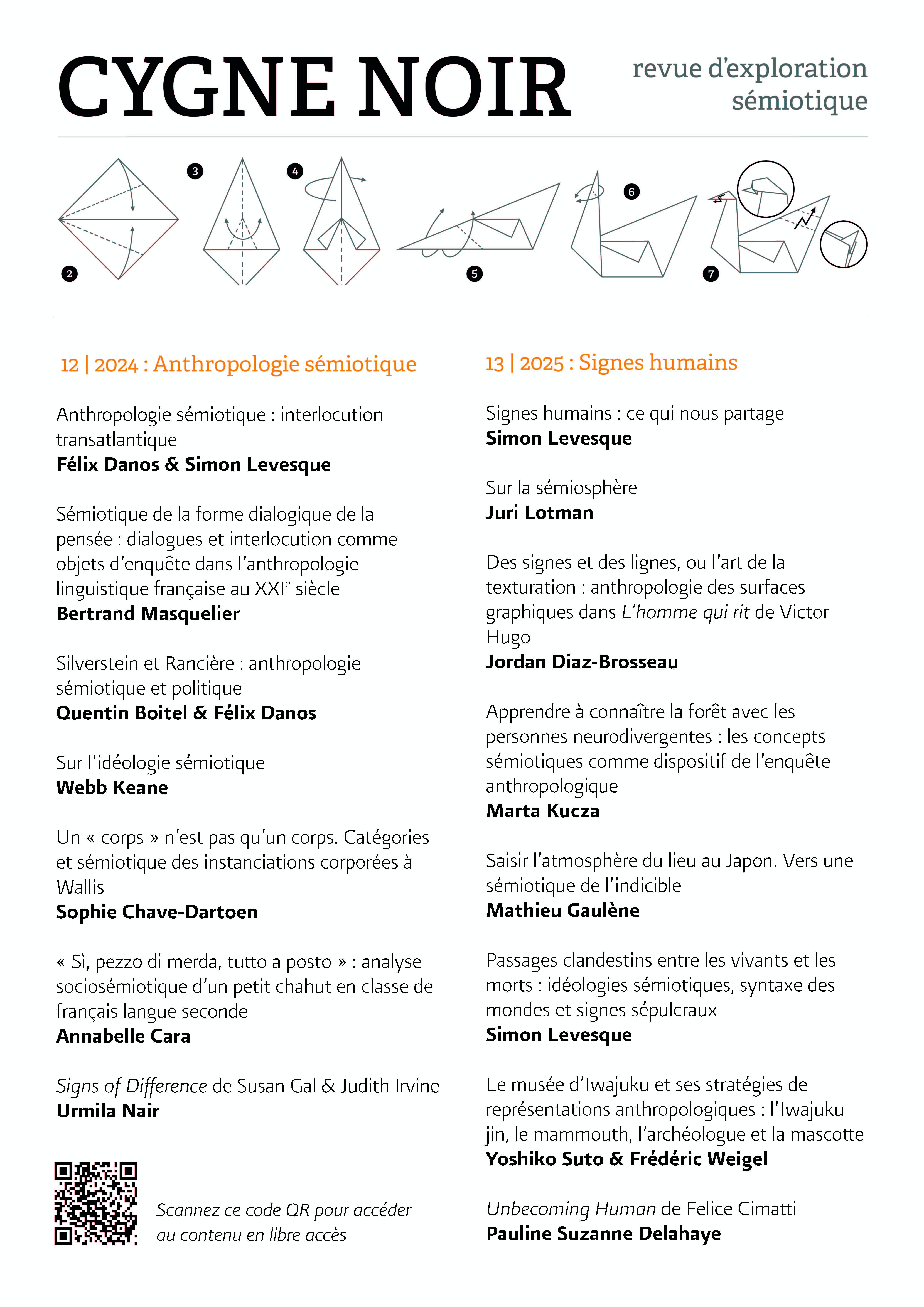 Le numéro courant « Signes humains » et le numéro précédent « Anthropologie sémiotique » sont offerts en libre accès sur la plateforme Érudit. Bonne lecture!
