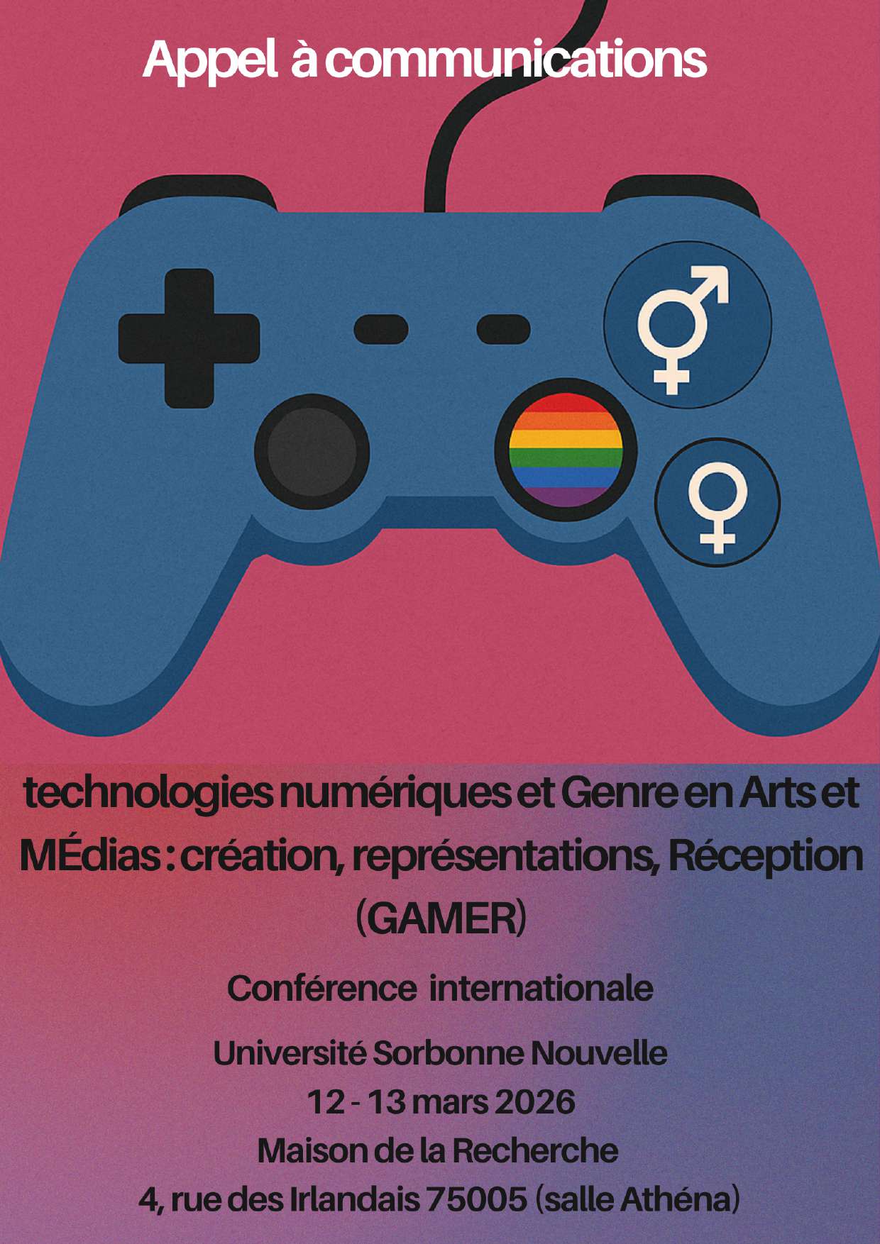 L’Institut de la communication et des médias de la Sorbonne Nouvelle organise avec plusieurs partenaires la conférence internationale bilingue Technologies numériques et genre en arts et médias (GAMER), qui se tiendra les 12 et 13 mars 2026 à la Maison de la recherche de la Sorbonne Nouvelle (salle Athéna). « Dans une perspective interdisciplinaire et transdisciplinaire, cette conférence vise à rassembler des chercheur-ses issu-es de diverses disciplines telles que la sociologie, les sciences de l’information et de la communication, les Gender Studies, les Cultural Studies, l’anthropologie, l’histoire, les sciences computationnelles, les sciences politiques, etc., en vue d’explorer les réflexions sur le genre dans les arts et les médias à l’ère numérique. Les recherches adoptant une perspective intersectionnelle, à la croisée des divers rapports sociaux de minoration (p. ex. genre, sexualité, classe sociale, race, validisme, âgisme, etc.), sont fortement encouragées. » Dimitra Laurence Larochelle (ancienne membre postdoctorante du CELAT) et Christine Thoër (CELAT) font partie du comité scientifique de l’événement. La date limite de soumission des propositions de communication est fixée au 1er octobre 2025.