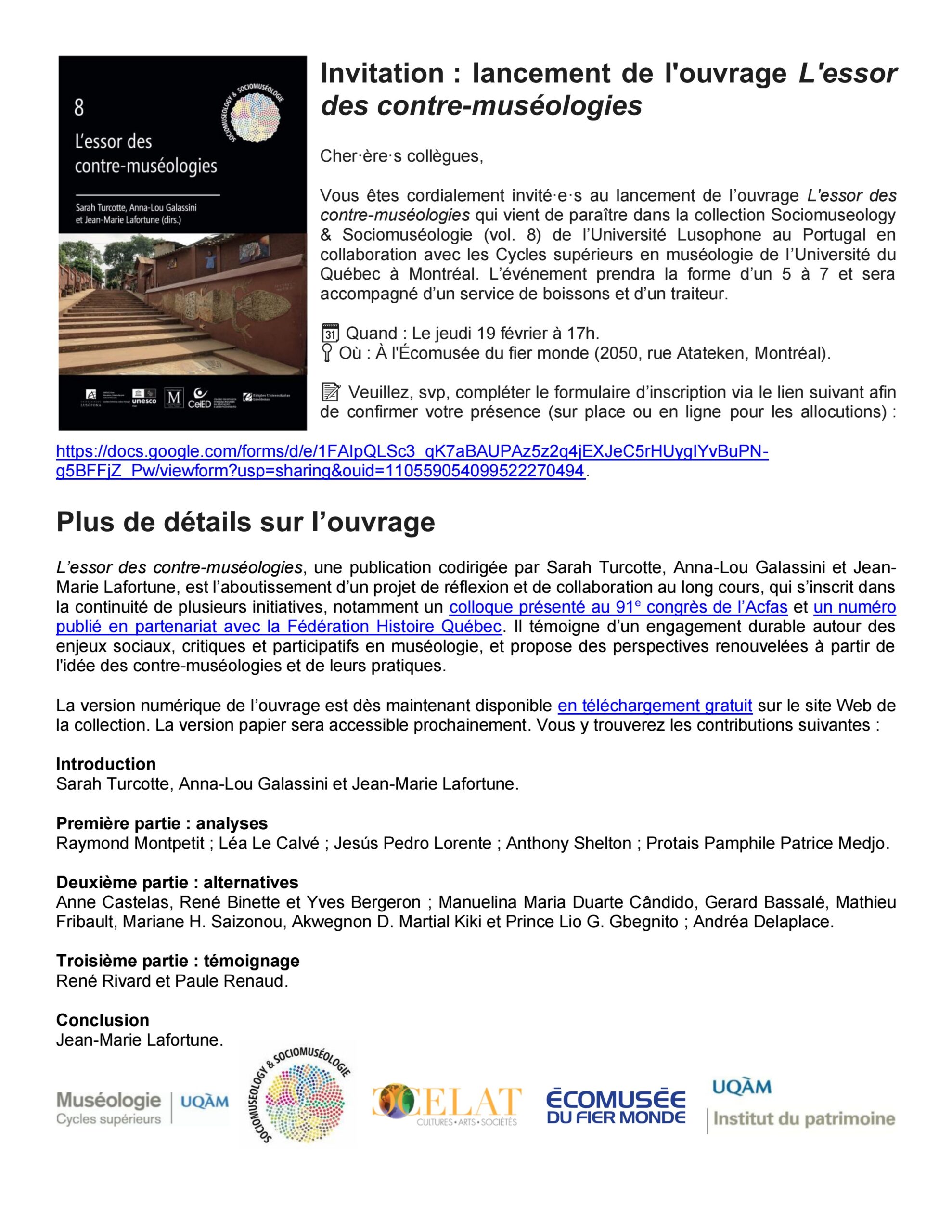« L’essor des contre-muséologies, une publication codirigée par Sarah Turcotte, Anna-Lou Galassini et Jean-Marie Lafortune, est l’aboutissement d’un projet de réflexion et de collaboration au long cours, qui s’inscrit dans la continuité de plusieurs initiatives, notamment un colloque présenté au 91e Congrès de l’Acfas et un numéro publié en partenariat avec la Fédération Histoire Québec. Il témoigne d’un engagement durable autour des enjeux sociaux, critiques et participatifs en muséologie, et propose des perspectives renouvelées à partir de l’idée des contre-muséologies et de leurs pratiques. La version numérique de l’ouvrage est dès maintenant disponible en téléchargement gratuit sur le site Web de la collection. La version papier sera accessible prochainement. »