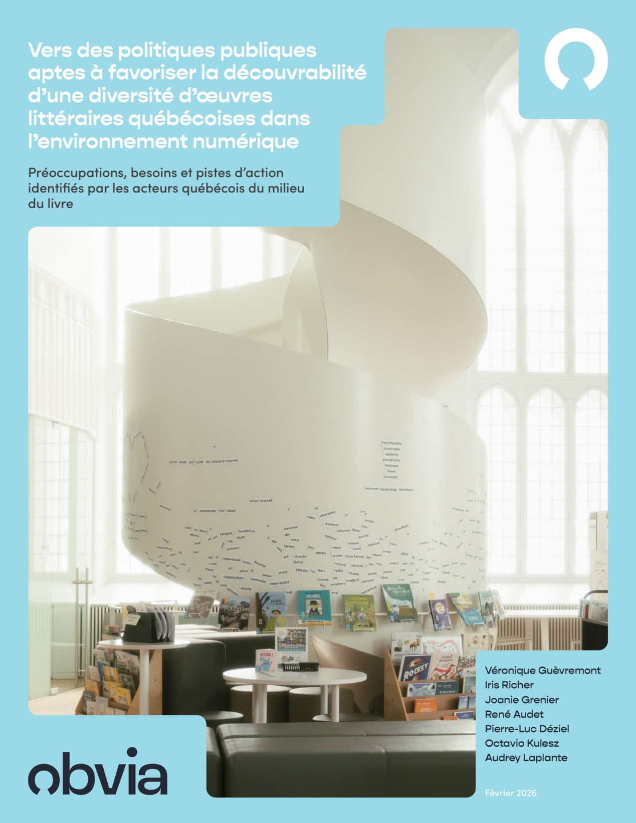 « Ce livre blanc présente les résultats d’un projet de recherche réalisé avec la collaboration d’acteurs du secteur du livre au Québec, qui a eu pour objectif d’identifier et synthétiser leurs expériences, préoccupations et besoins eu égard à la thématique de la découvrabilité des œuvres littéraires québécoises dans l’environnement numérique. Ce livre blanc suggère également des mesures de politiques publiques qui pourraient être déployées afin de répondre à ces enjeux. »