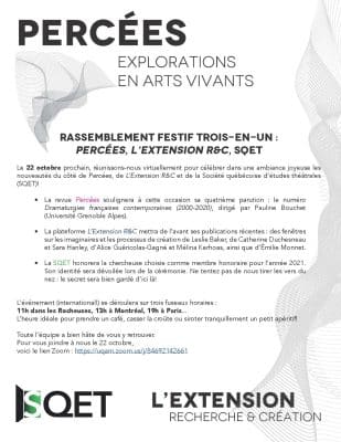 La revue Percées – Explorations en arts vivants, dirigée par Catherine Cyr et Jean-Paul Quéinnec (CELAT), fait paraître son quatrième numéro, « Dramaturgies françaises contemporaines (2000-2020) », sous la responsabilité de Pauline Bouchet. Le lancement, prévu sur Zoom le vendredi […]