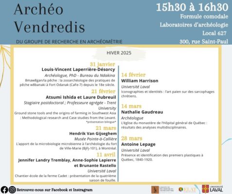 Le Groupe de recherche en archéométrie vous invite à une journée consacrée à l’étude de l’archéologie biomoléculaire le vendredi 4 avril dans les locaux des Laboratoires d’archéologie de l’Université Laval […]