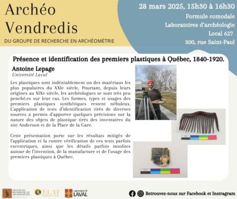 Dans le cadre du prochain Archéo-vendredi du Groupe de recherche en archéométrie, notre membre étudiant Antoine Lepage (UL) présentera ses recherches de maîtrise portant sur l’identification des premiers plastiques à […]