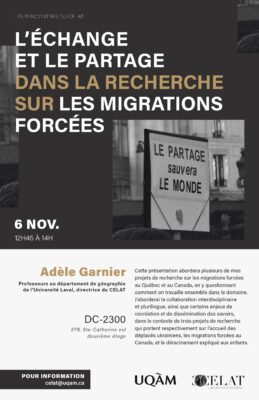 Conférence d’Adèle Garnier « Réflexion sur l’échange et le partage dans la recherche sur les migrations forcées au Canada et au Québec »
