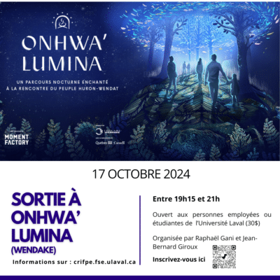Le jeudi 17 octobre, de 19 h 15 à 21 h, les membres du CELAT sont invité-es à découvrir Onhwa’ Lumina, un parcours nocturne enchanté à Wendake « célébrant la […]