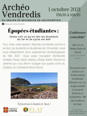 Dans le cadre des Archéo-vendredis, le Groupe de recherche en archéométrie vous invite, le vendredi 1er octobre à 15 h 30, à une rencontre sur le thème « Épopées étudiantes ». Clotilde, […]