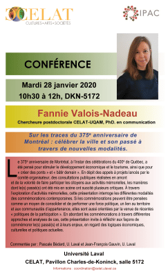 Le mardi 28 janvier 2020, le CELAT vous invite à la conférence de Fanny Valois-Nadeau, chercheure postdoctorale CELAT-UQAM, PhD. en communication : Sur les traces du 375e anniversaire de Montréal : célébrer la ville […]