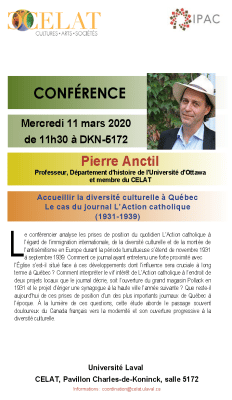 Mercredi 11 mars 2020 à 11h30, à la salle du CELAT DKN-5172 se tiendra la conférence de monsieur Pierre Anctil, professeur, département d’histoire de l’Université d’Ottawa et membre du CELAT. Bienvenue […]