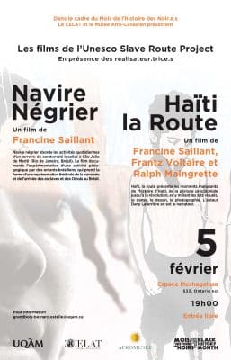 Dans le cadre du Mois de l’histoire des Noir.e.s, le Musée Afro-Canadien et le CELAT-UQAM vous invitent à la projection des films Navire Négrier, de Francine Saillant, et Haïti – […]