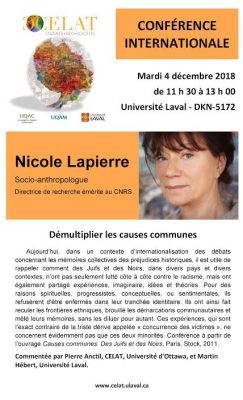 Invitée à titre de conférencière internationale du CELAT, Nicole Lapierre, socio-anthropologue, directrice de recherche émérite au CNRS, codirectrice de la revue Communications et directrice de la collection Un ordre d’idées […]