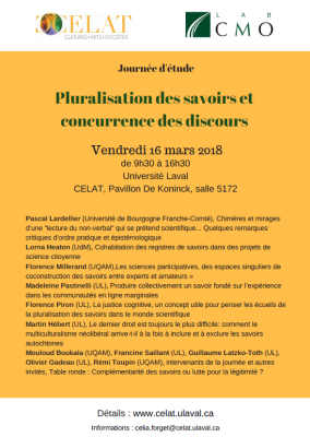 Le vendredi 16 mars de 9h30 à 16h30, Madeleine Pastinelli (CELAT) organise, en collaboration avec le LabCMO, à l’Université Laval, De Koninck, salle 5172, une journée d’étude consacrée à la […]