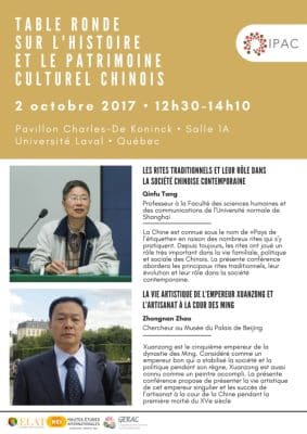 Lundi 2 octobre, l’IPAC à l’Université Laval vous invite à assister à une table ronde sur l’histoire et le patrimoine culturel chinois à partir de 12h30, au local 1A du […]