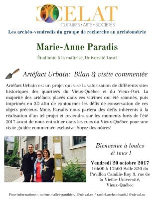 Vendredi 20 octobre 2017, le groupe de recherche en archéométrie, accueillera son troisième archéo-vendredi de la session. Marie-Anne Paradis, étudiante à la maîtrise à l’Université Laval y présentera une communication […]
