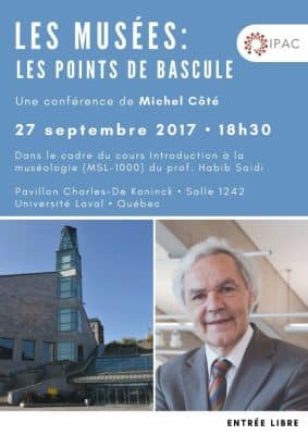 Le mercredi 27 septembre prochain, à 18h30 salle DKN-1242, l’IPAC accueillera, Michel Côté, ancien directeur du Musée de la civilisation de Québec pour une conférence intitulée : Les musées : […]