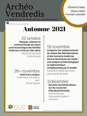 Plusieurs belles activités en formule comodale vous attendent cet automne dans le cadre des Archéo-vendredis. Rachel Archambault, membre étudiante du CELAT dirigée par Allison Bain, présentera la conférence « Flasques, shooters […]