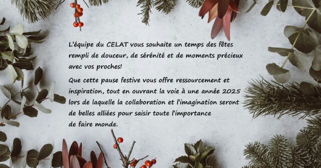 L’équipe du CELAT vous souhaite un temps des fêtes rempli de douceur, de sérénité et de moments précieux avec vos proches! Que cette pause festive vous offre ressourcement et inspiration, […]